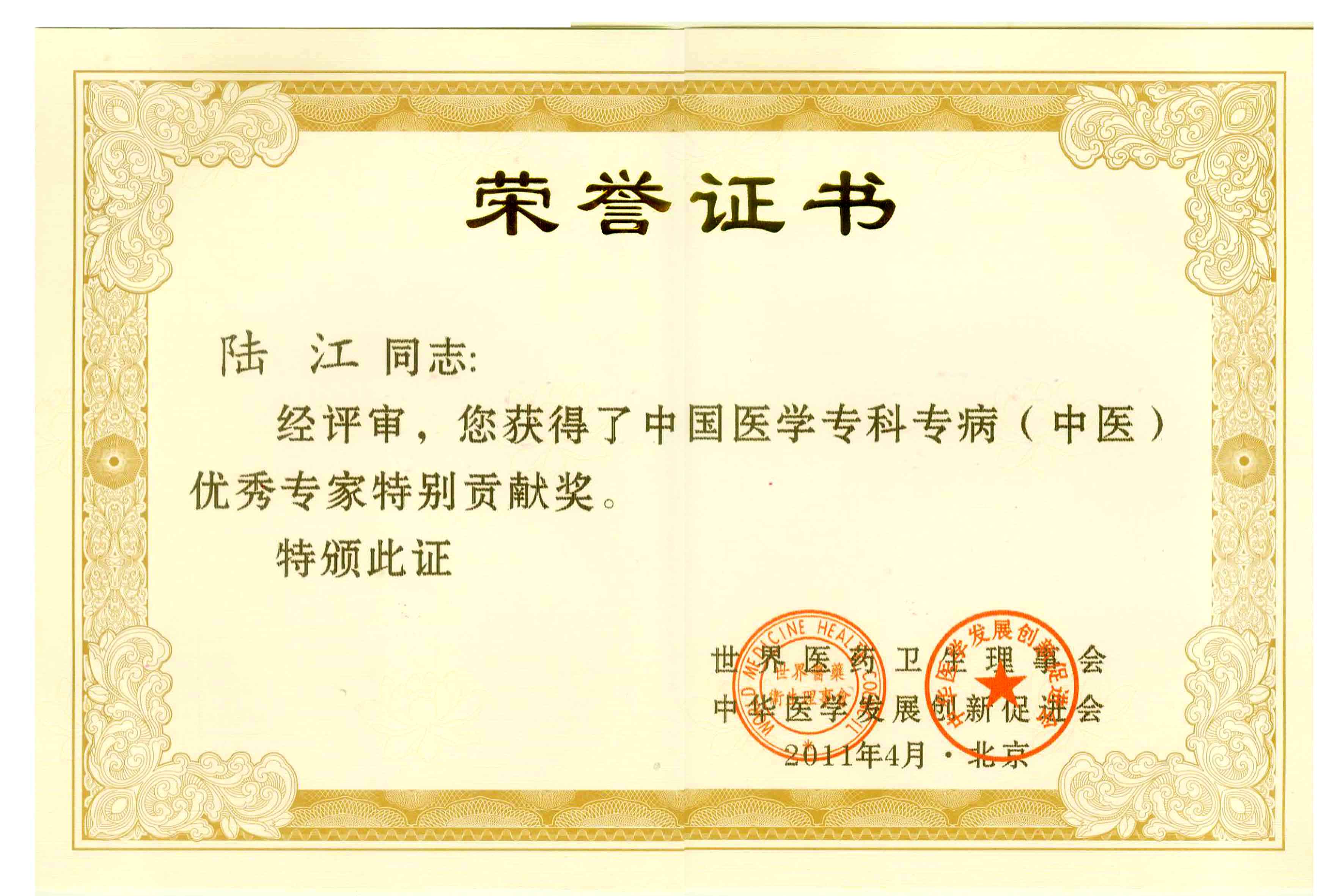 陸江獲得中國醫學專科專病優秀專家恃別貢獻獎